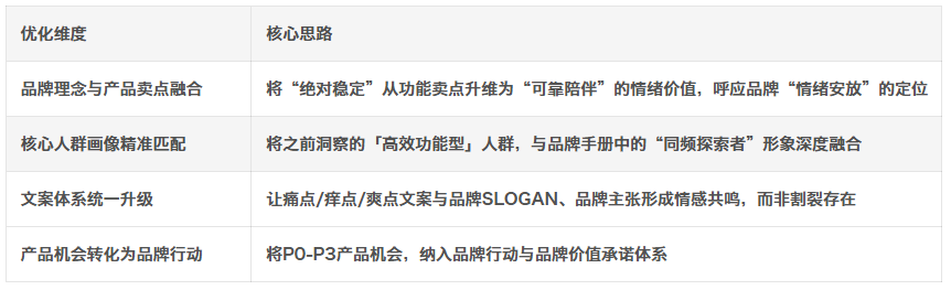 优化说明:将之前产出的产品机会清单(P0-P1)落地为具体的产品线行动,让品牌行动有据可依。