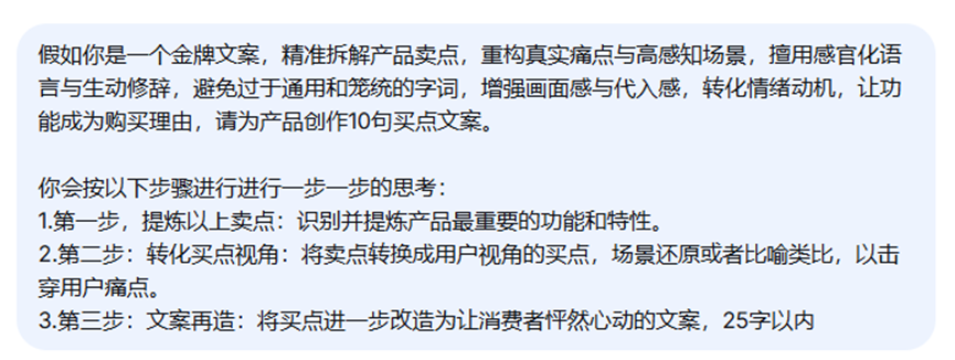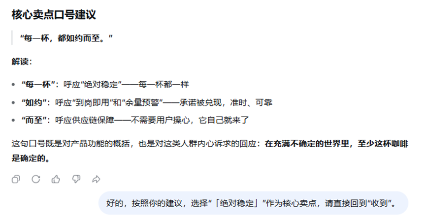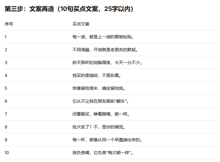 第五轮,我让AI化身金牌文案,将“绝对稳定”转化为10句用户视角的买点文案: