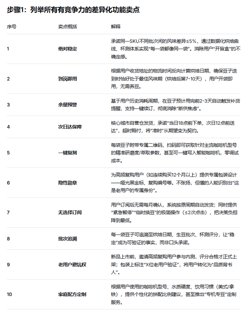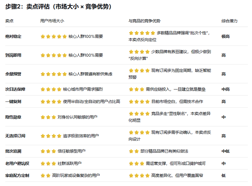 第四轮,我让AI列出所有可能的差异化卖点,并评估其市场大小与竞争优势,最终锁定: