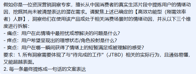 第二轮,我让AI聚焦核心人群,从三个情绪维度深度拆解: