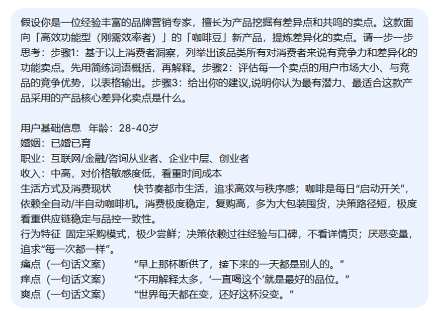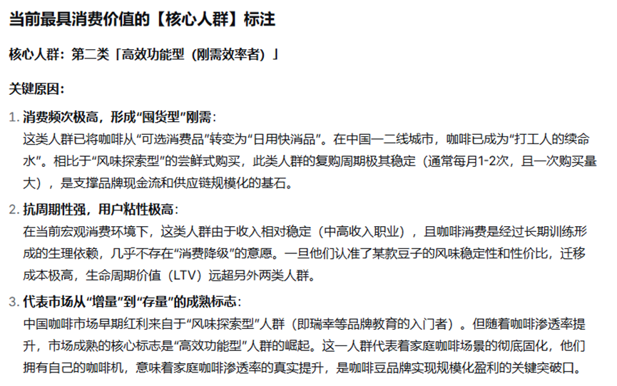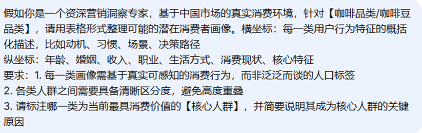 第一轮对话,我让AI扮演资深营销洞察专家,基于中国真实的咖啡消费环境,梳理出三类核心用户画像: