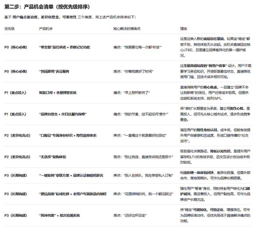 第三轮,我将每一个痛点/痒点/爽点对应为具体的产品需求,并输出优先级清单:
