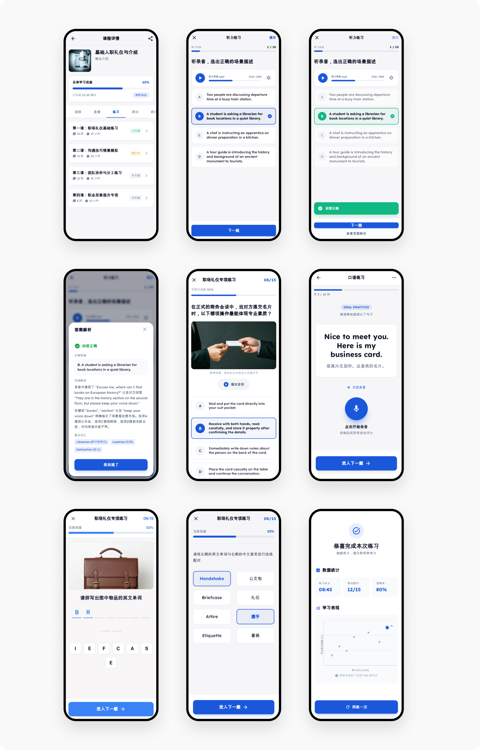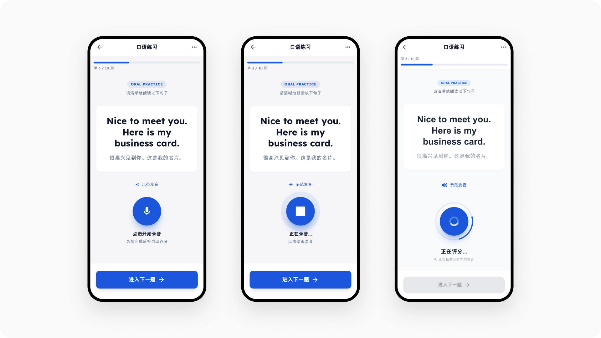 我想单独说一下口语题的设计细节。这里的交互比较细致,如果你没有做过类似流程,可能很难理解其中包含的各种微交互细节。