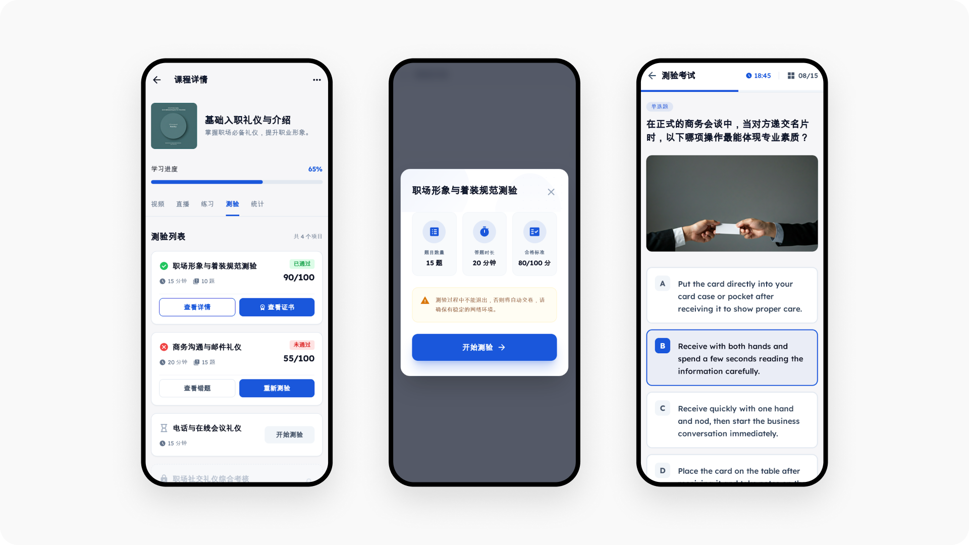 课程详情页是一个聚合多种功能的页面。用户进来之后,会在同一个空间里看到视频、直播、练习和测验。