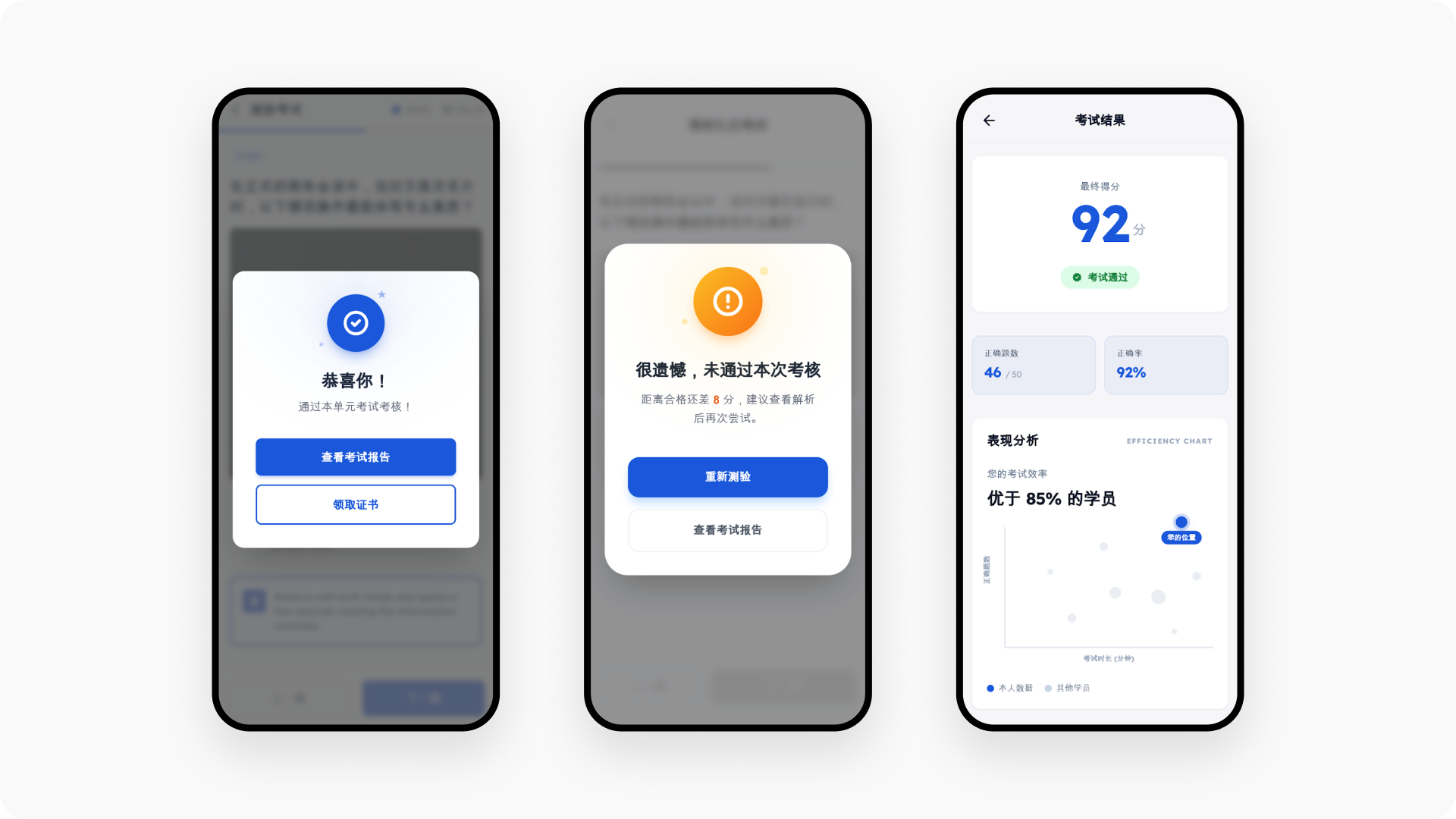 最后再分享一个考试提交流程。用户考过或失败,系统都需要及时提示。进入考试结果页后,我还需要更细致的数据统计和考试表现统计。Stitch 一开始表现不佳,无法理解如何设计考试表现统计图。于是我补充了更具体的描述:X 轴单位为考试时长,Y 轴单位为答对题目数量,并需要与其他学员进行综合比较。