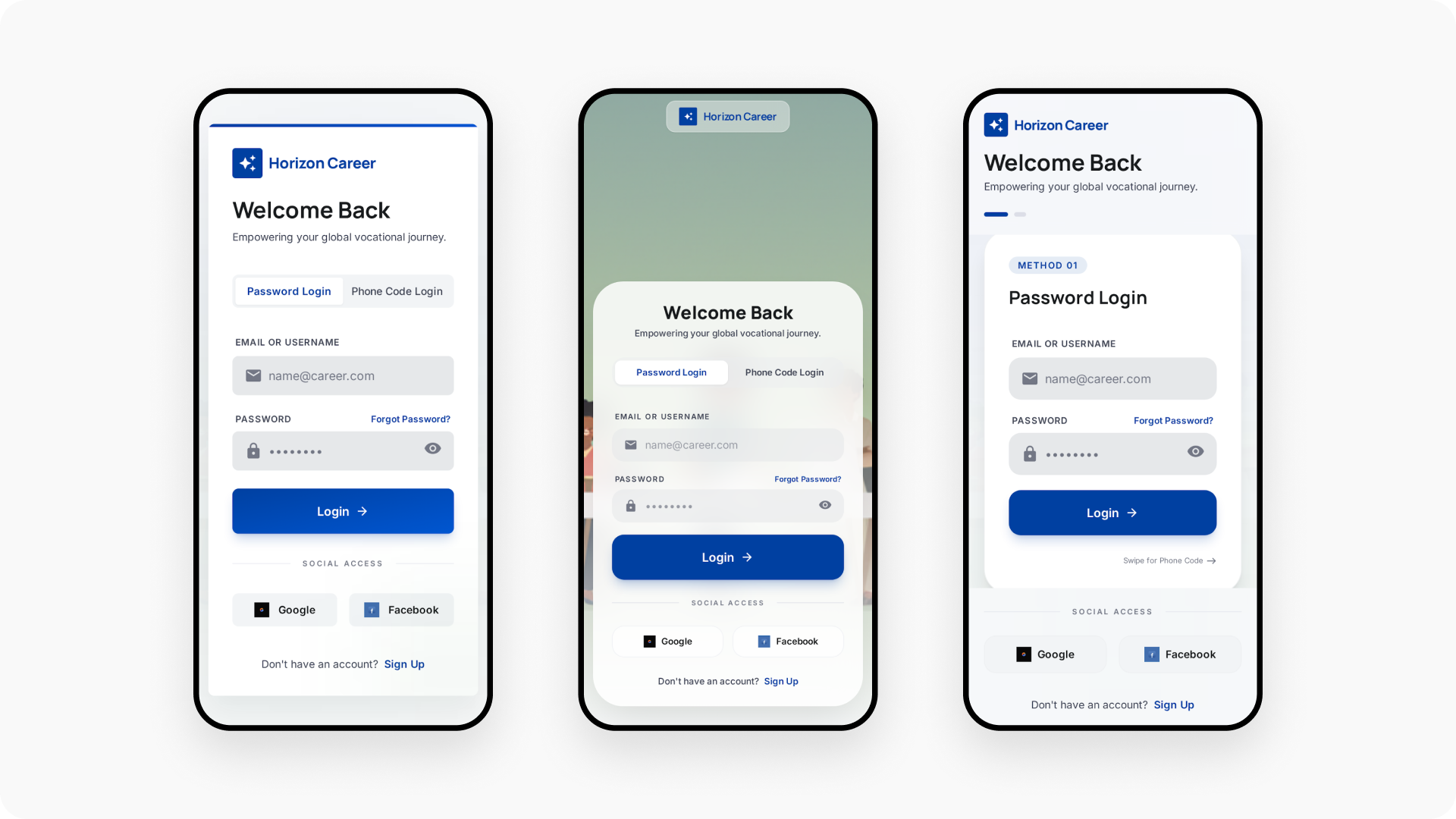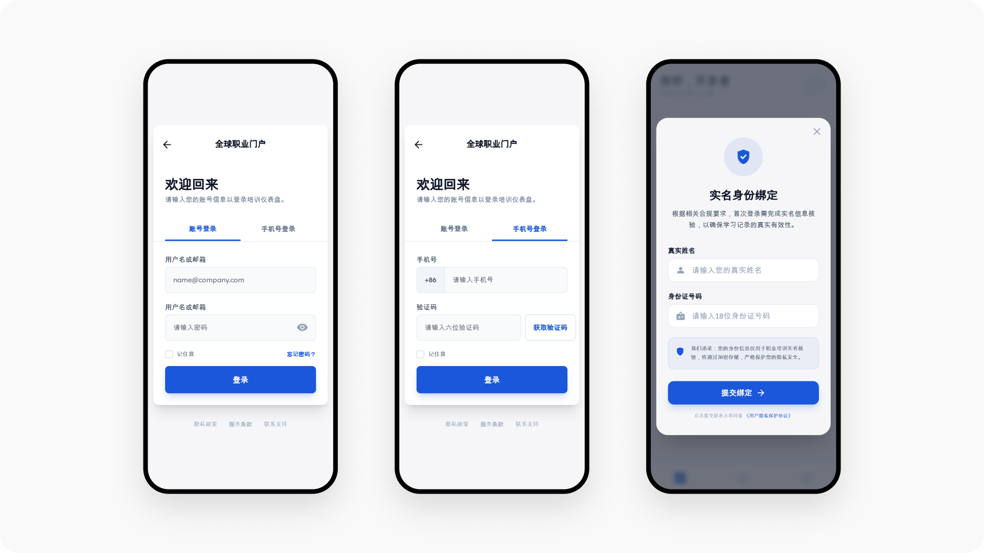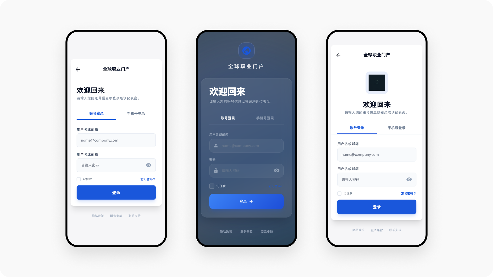 为我设计一个用户登录验证流程,需要支持账号密码和手机号验证登录两种方式。但请注意,这是一个 B 端业务场景,不需要任何第三方登录方式,页面必须简洁、干净。