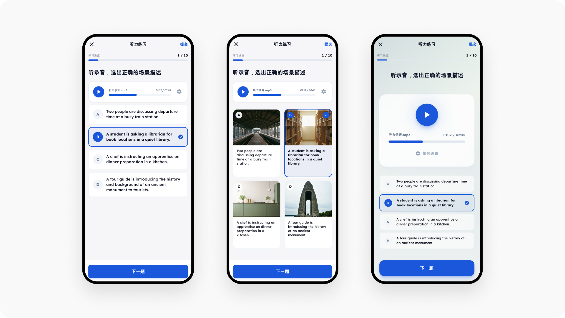 首先是听力题。我先让 Stitch 自由发挥,输出样式供我参考。练习题这种场景在国外产品中很常见,比如多邻国、博树等,都有大量丰富的题型。这些产品我都做过拆解分析,如果你感兴趣,可以去看之前的内容。