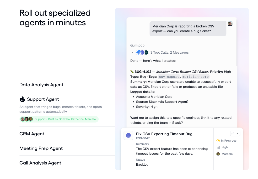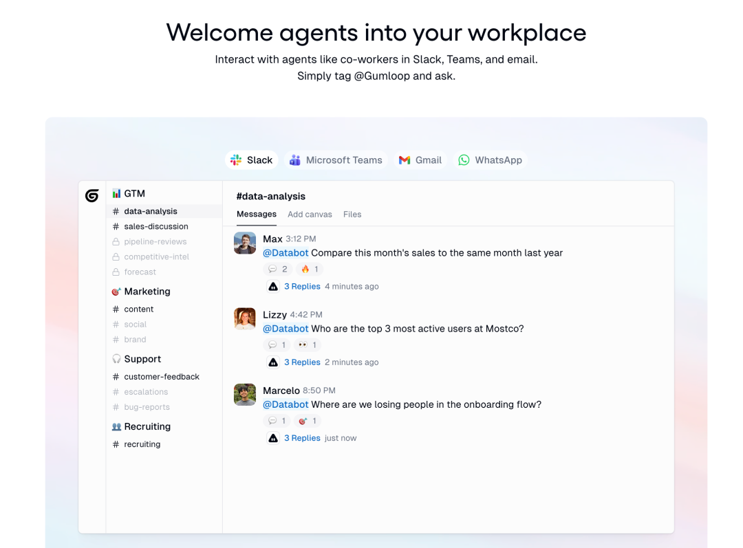 第一个组件是 Gumloop Agents,这是主动式的 AI agent,公司里的任何人,从市场营销实习生到 CEO,都可以在几分钟内构建出来。这些 agent 可以连接到数百个应用程序,并原生部署在 Slack、Microsoft Teams 或电子邮件等工作空间中。我认为这个设计非常聪明,因为它不需要用户改变现有的工作习惯。员工已经在 Slack 里沟通,已经在邮件里处理任务,AI agent 直接嵌入到这些熟悉的环境中,而不是要求用户学习使用一个全新的界面。