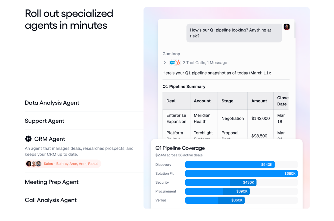 第二个组件是核心的 Gumloop 平台,它让团队能够协作构建、分享和编排整个业务中的 agent 和自动化流程。这里有一个我特别欣赏的设计:员工可以分享他们构建的 agent。这创造了一种复合效应,加速了内部自动化的采用。想象一下,销售团队的某个人构建了一个 agent 来自动更新 CRM 系统,他可以把这个 agent 分享给整个销售团队,甚至其他部门的同事。其他人可以直接使用这个 agent,或者在它的基础上进行修改以适应自己的需求。这种自下而上的传播方式比传统的自上而下的 IT 部署要快得多、有效得多。