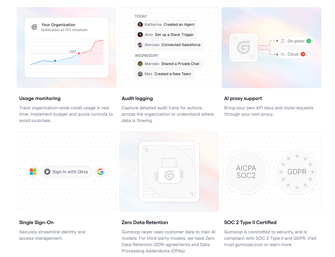 第三个组件是 Gumstack,这是专门为安全团队构建的平台,用于监控和控制整个组织的 agent 数据使用情况。这个组件解决了企业采用 AI 时最大的顾虑之一:安全性和合规性。Gumstack 不仅追踪在 Gumloop 上的数据使用,还记录和审计整个组织中所有工具调用,包括 Claude Code、ChatGPT、Cursor 和内部自定义 agent 等。所有这些都被记录下来并可审计。这让安全团队在 AI agent 推广过程中拥有完全的清晰度和信心。