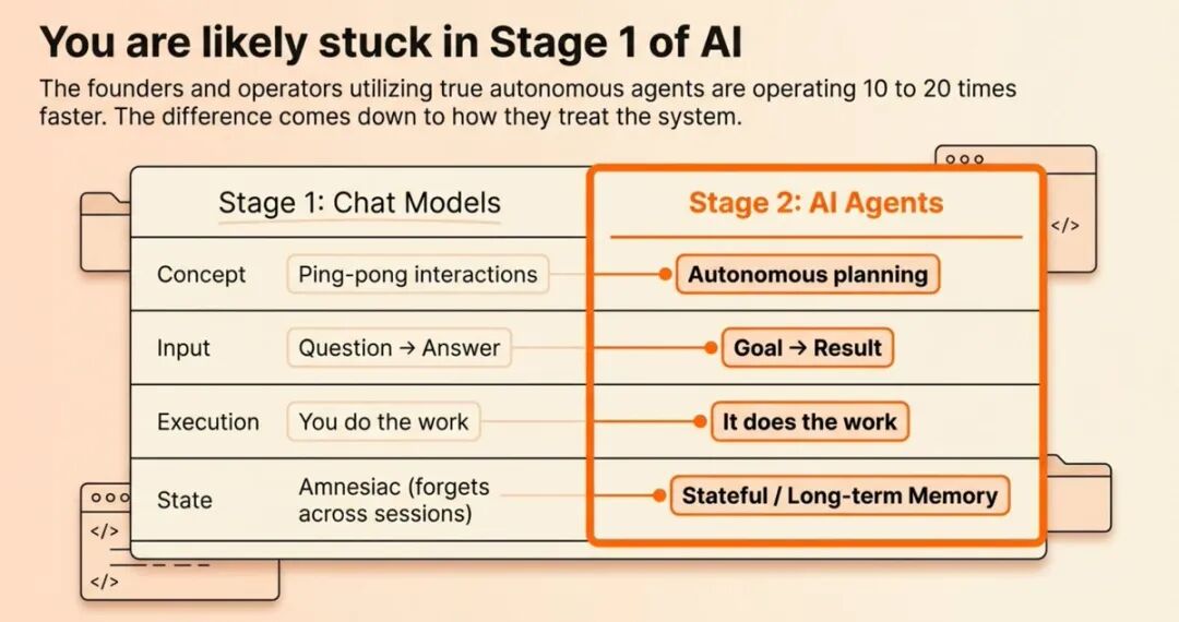 你是否还在一个个标签页之间来回切换,复制粘贴信息,手动完成那些重复性工作?大多数人使用 AI 的方式还停留在最初级的阶段:输入问题,获得答案,然后自己动手完成工作。但有一小群人已经跨越到了完全不同的维度,他们让 AI agent 自动管理邮件、日历、广告投放和日常运营,生产力提升了 10 到 20 倍。这不是夸张,而是正在发生的现实。