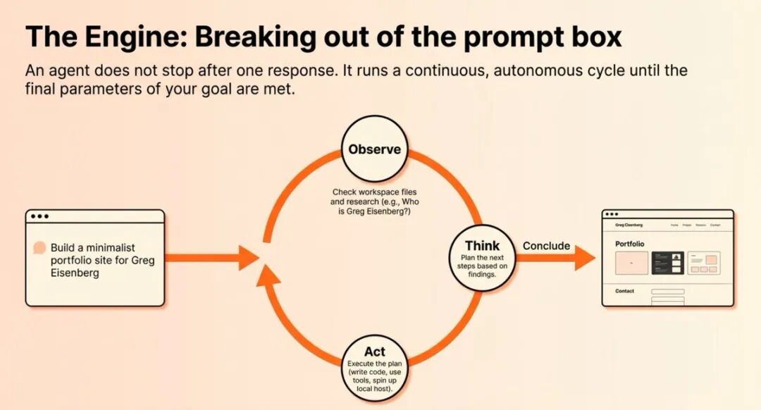 Remy 用一个具体案例演示了这个循环的运作方式。假设你给 agent 一个任务:”为 Greg Eisenberg 搭建一个作品集网站。”agent 不会直接开始写代码,而是会启动这个循环。第一步,它会检查工作空间中是否有现有文件(observe)。发现没有相关信息后,它会判断需要先研究 Greg Eisenberg 是谁(think)。接着,它就会去执行这个研究工作(act)。完成研究后,循环重新开始。现在它掌握了研究成果,会思考:”我需要制定一个计划。”于是它写下计划。再次循环,开始编写代码。又一次循环,启动网站。再循环一次,截图验证任务是否完成。