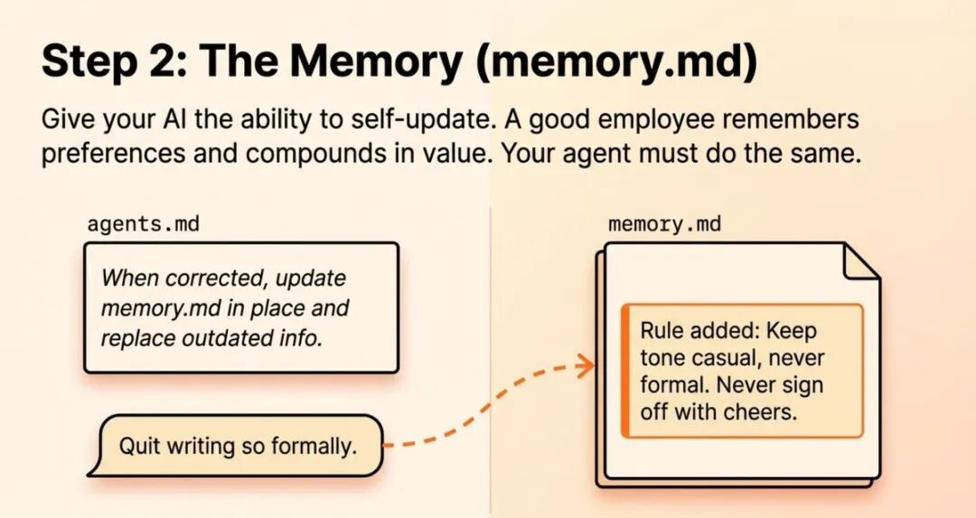 现在,当你说”别写得那么正式”,agent 会在 memory.md 中更新记录:”保持语气随意,永远不要正式”。每次未来的会话都会继承这个偏好。这就像训练一个真正的员工。优秀的员工会记住你的偏好并随着时间不断改进,你的 agent 也应该如此。我按照这个方法配置后,发现 agent 的表现确实会随着时间推移越来越符合我的期望。它会记住我不喜欢用”显著”这个词,会记住我倾向于用数据支撑观点,会记住我喜欢简短的段落而不是长篇大论。