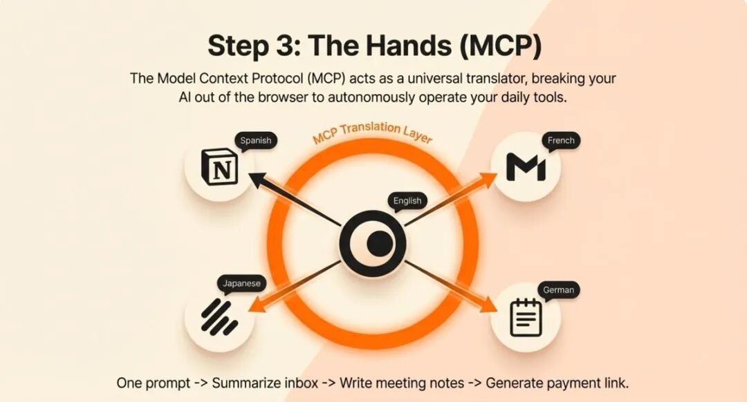 有了大脑和记忆后,agent 仍然是孤立的。它只能在自己的小世界里工作,无法访问你日常使用的各种工具和平台。这就引出了下一个关键组件:MCP(Model Context Protocol,模型上下文协议)。
