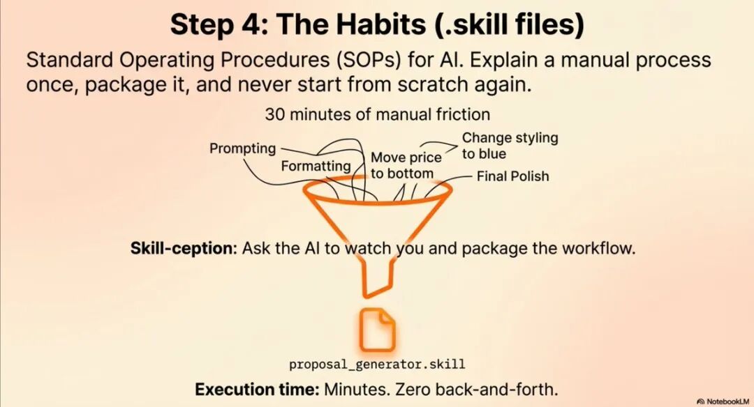 更关键的是,技能是可以累积的。如果你每周自动化 3-5 个微小的手动流程,最终你会自动化整个工作流。这不是一夜之间发生的,而是一个渐进的过程。但正因为是渐进的,它可持续、可控制。你不是突然把所有工作交给 AI 然后祈祷它不出错,而是一点一点地将那些重复性、规则明确的任务转化为技能,逐步优化和完善,直到整个系统稳定可靠。