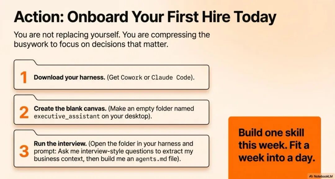 循环非常简单:连接工具 → 构建上下文 → 创建技能 → 自动化流程 → 重复。从执行助理开始,本周构建一个技能,下周再构建一个。把这个过程堆叠数月,你就能把一周的工作压缩进一天。这不是科幻,而是现在就可以实现的现实。