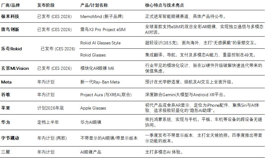 2026年AI眼镜行业部分新品发布及规划概览 图源:洞见新研社