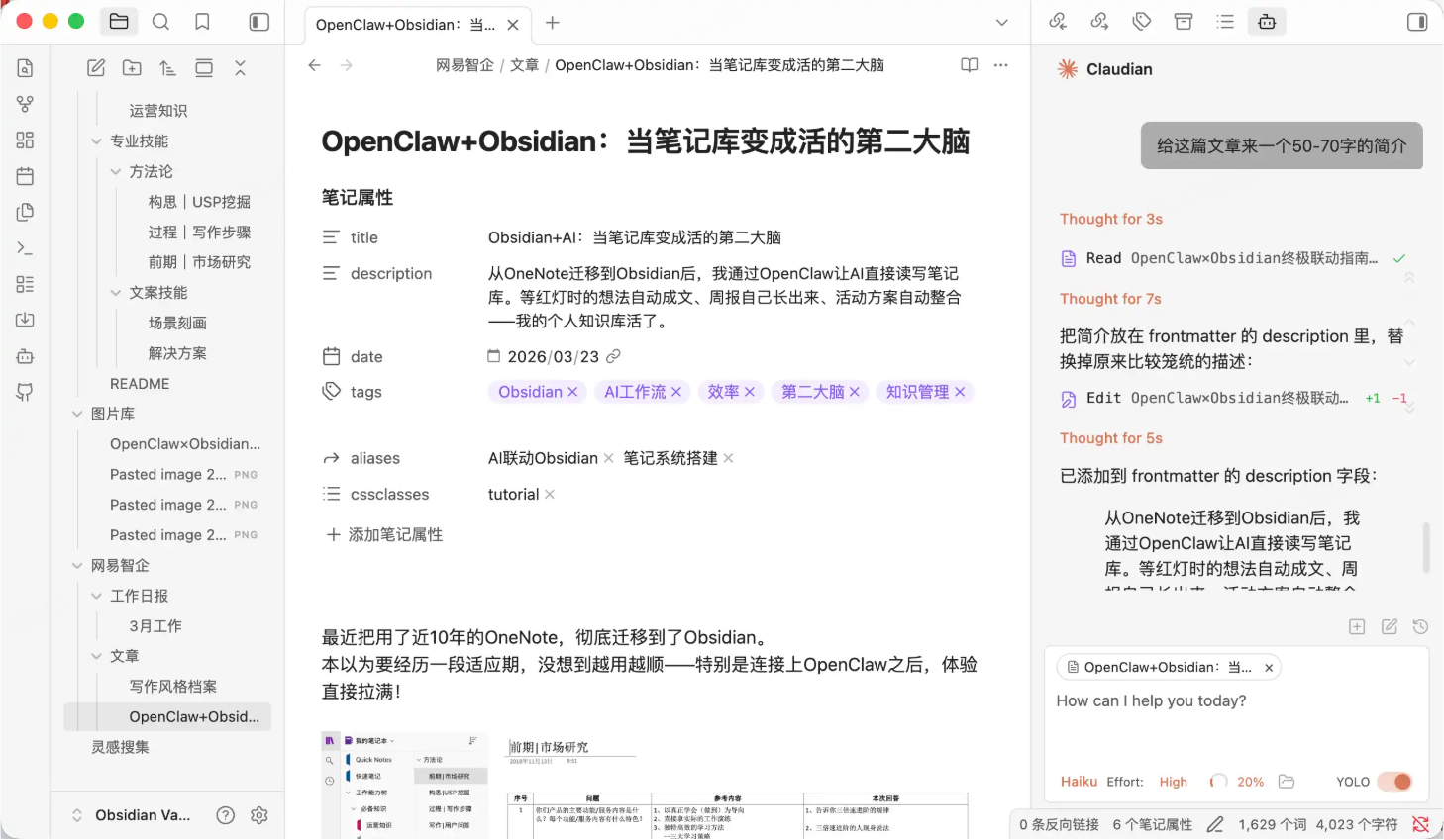 晚上10点打开 Obsidian,《OpenClaw+Obsidian:当笔记库变成活的第二大脑》已经写好了初稿。结构清晰,例子完整。