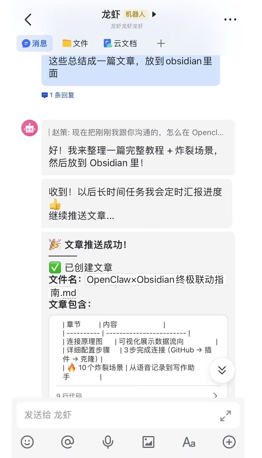 于是我对着龙虾说:”刚刚的过程,写一篇文章Obsidian 上…”