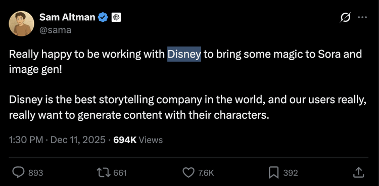 Disney和OpenAI签了一笔据说高达$10亿美元的协议,200个经典IP授权Sora使用。米奇、星球大战、漫威——这是好莱坞最昂贵的输血。从账面上看,这是续命针;从叙事上看,这是绝佳的路演素材,Altman在各种场合反复提到这笔合作,言下之意:连Disney都来了,Sora一定行。