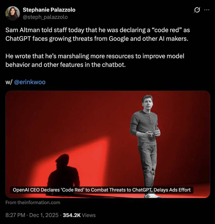2025年12月,Altman在内部发出了一份名为「Code Red」的备忘录。内容是:OpenAI的消费者产品增长已经停滞,算力成本正在吞噬利润,需要全面收缩。