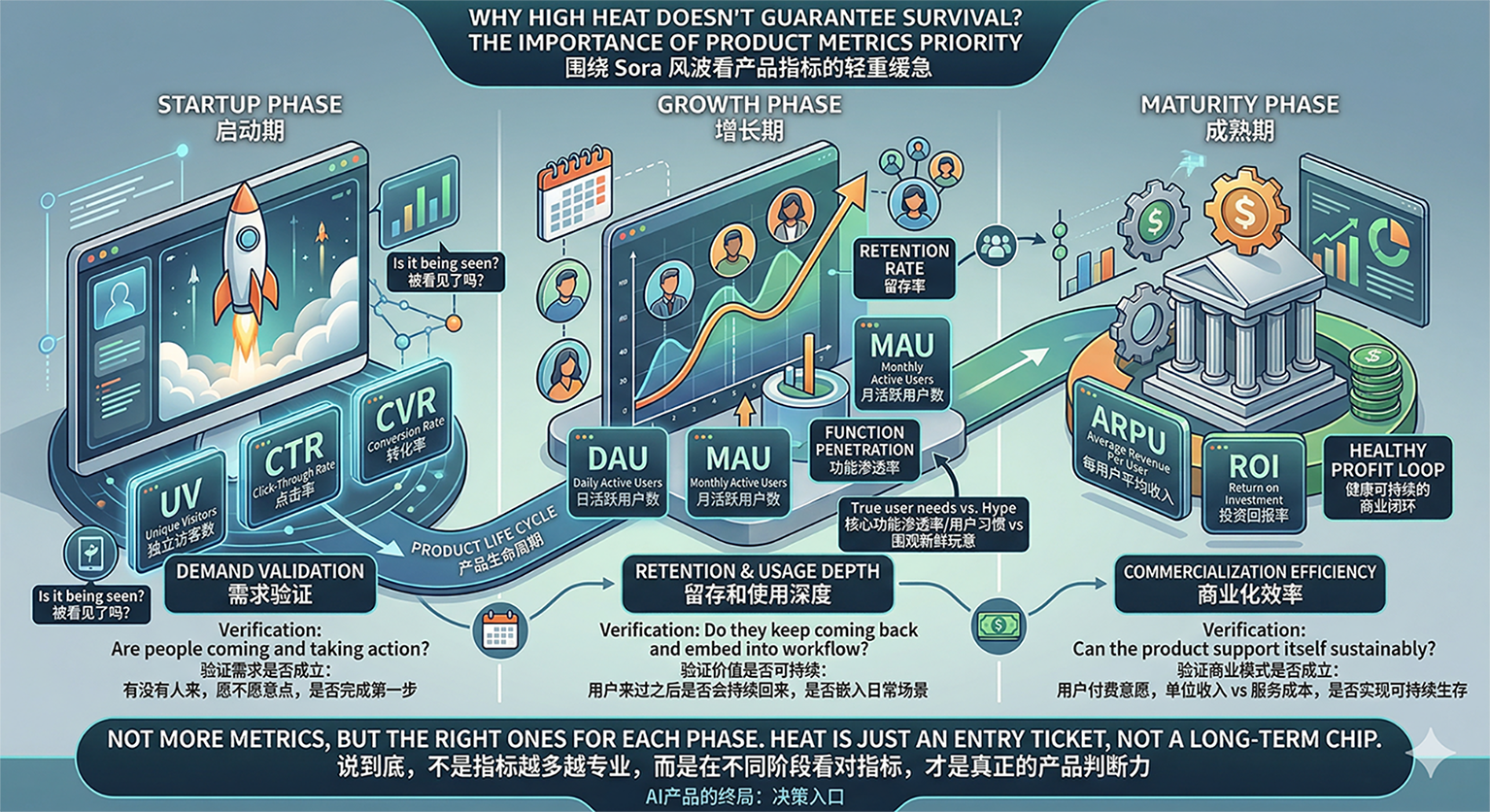 从产品生命周期来看,不同阶段本来就该看不同的指标。如果启动期看的是热度,增长期还只盯热度,成熟期依然拿热度当答案,那产品大概率会被带偏。无论是 Sora,还是其他一度爆红的明星产品,它们都在提醒一件事:热闹从来不是结果,它最多只是开始。
