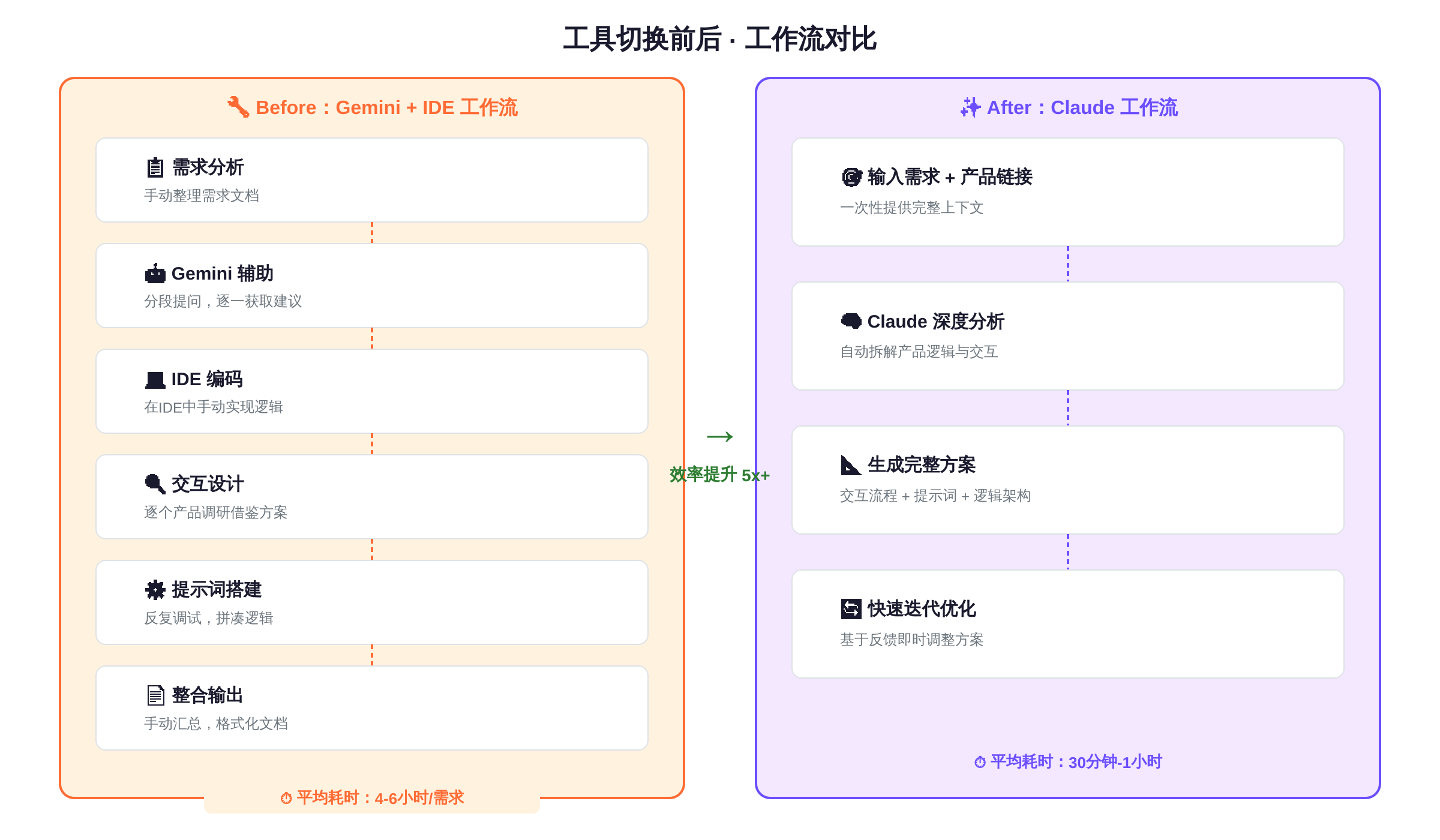为了让大家更直观地感受这个变化,我把切换前后的工作流做了一个完整的对比。先看全景图: