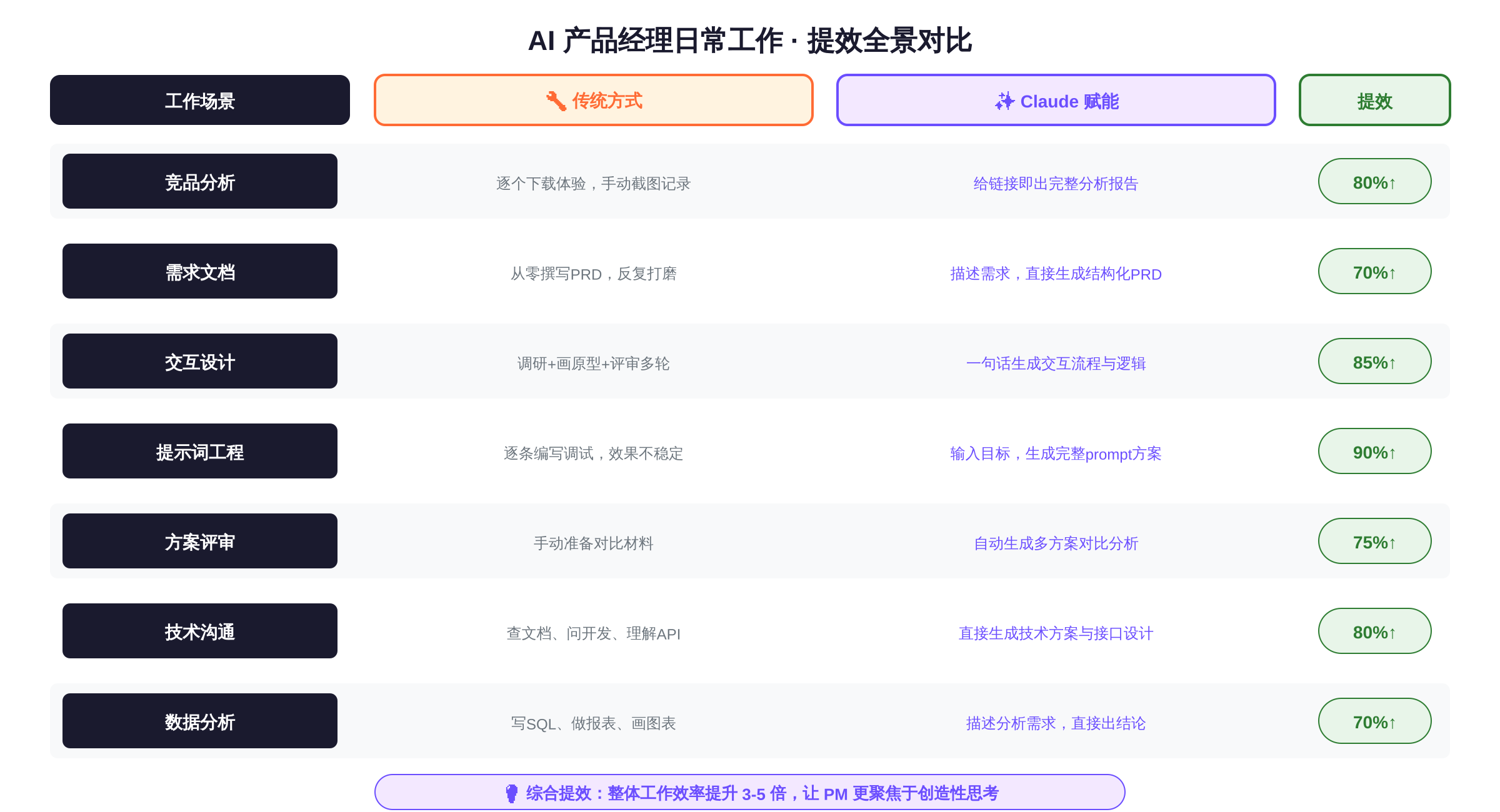 随着使用的深入,我发现 Claude 的价值远不止于交互设计。作为AI产品经理,我的日常工作涵盖了竞品分析、需求文档、交互设计、提示词工程、方案评审、技术沟通、数据分析等多个场景,而 Claude 几乎在每一个场景都能带来显著的效率提升。