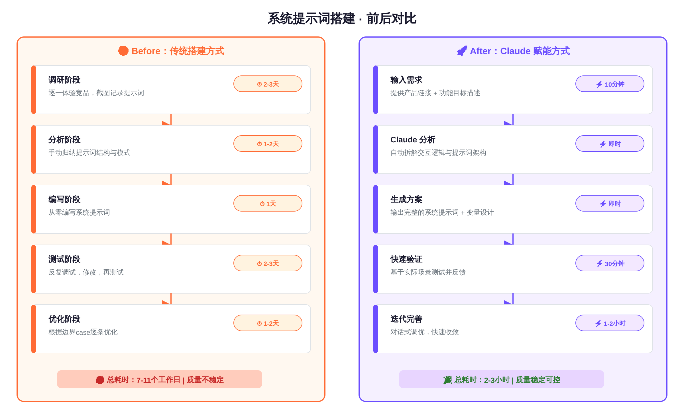 过去的方式是这样的:先花几天调研竞品,看看别人的提示词是怎么写的;然后手动归纳结构模式;接着从零编写;再反复测试、调优。整个过程通常需要7到11个工作日,而且由于人工调试的局限性,质量还不太稳定。