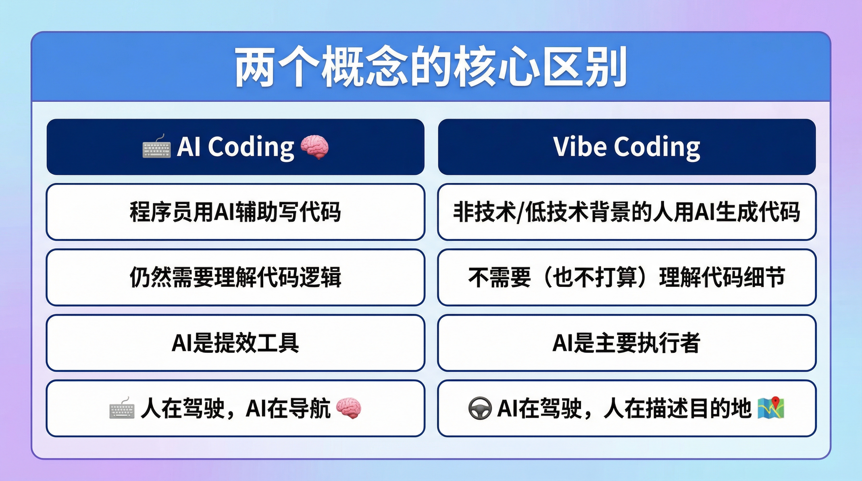还有一个更深层的混淆:Vibe Coding 和 AI Coding 经常被混用,但它们不是一回事。