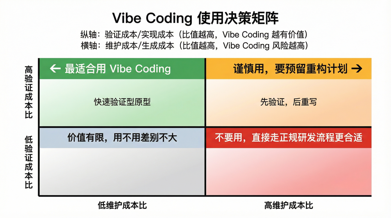 当一个系统的”维护成本”(上线后持续迭代、修复、扩展需要多少投入)远高于”生成成本”(第一次做出来需要多少投入)时,Vibe Coding 的风险最高。