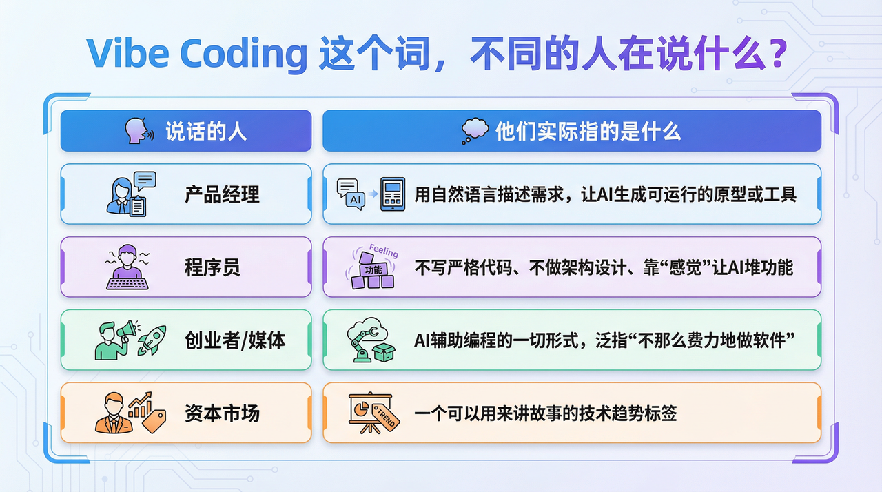 产品经理说的 Vibe Coding,是”我终于能把脑子里的想法快速变成可以点击的东西”;程序员说的 Vibe Coding,是”一种不负责任的、会产生技术债的开发方式”。 这两拨人压根不在同一个讨论频道里,但他们用的是同一个词,所以争论永远结束不了。