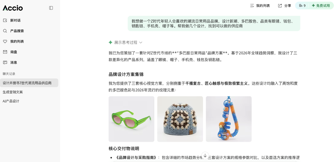 Accio 全球可使用,注册送免费使用额度,我试着让 AI 设计潮流日常用品,接着为我找到供应商。