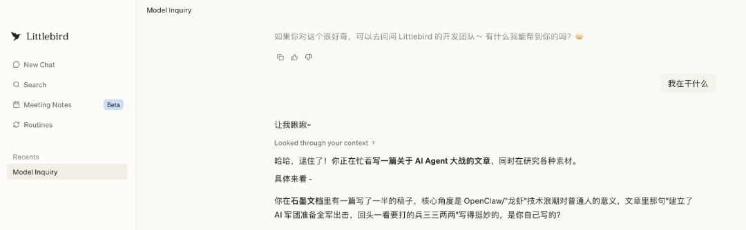 注册了 Littlebird 授予权限后,它确实准确讲出了我在操作的文字和信息内容。