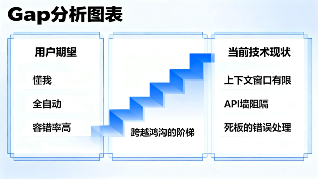 用户的真实需求是“把事办妥”(Get Things Done),而产品现有能力往往停留在“提供操作说明”层面。这中间巨大的 Gap,正是 AI 时代产品经理需要填补的战场。我们需要用更好的底层架构和更细致的体验设计来跨越这个鸿沟。