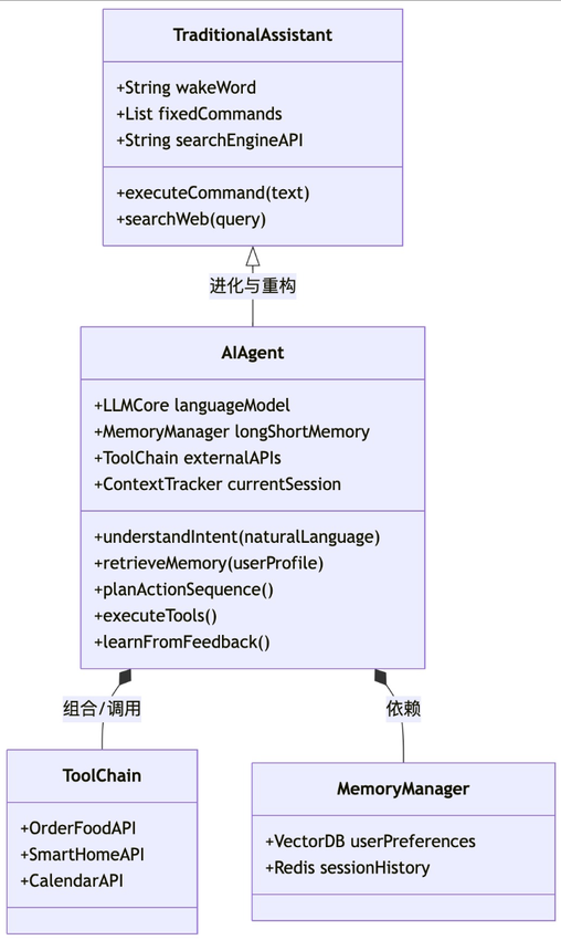 为了更清晰地展示这种演进,我们可以通过类图(Class Diagram)来看看传统语音助手与现代 AI 智能体在系统架构和属性上的本质差异: