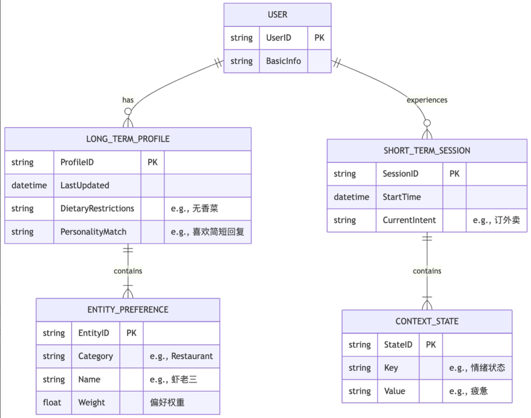 我们使用实体关系图(ER Diagram)来展示一个现代 AI 助手的记忆系统是如何组织的: