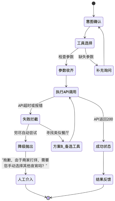 如何设计”失败降级”机制,让 AI 不尴尬现实环境是混沌的。如果调用的外卖接口报错怎么办?优秀的 AI 助手不仅会规划,还会“重新规划(Re-planning)”。我们通过状态图(State Diagram)来看看一个具备鲁棒性(Robustness)的行动层是如何处理异常的: