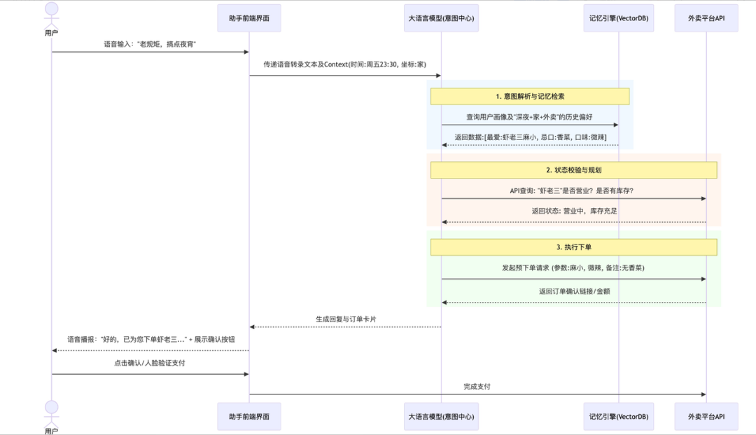 - 意图识别(Intent Recognition):用户说“老规矩”。系统的大脑(LLM)首先介入,分析语义。结合当前时间(晚上 11:30)和位置(家中),大模型推断出这里的意图是“点夜宵”。