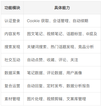 这个项目是目前最成熟的小红书自动化解决方案,支持以下核心功能: