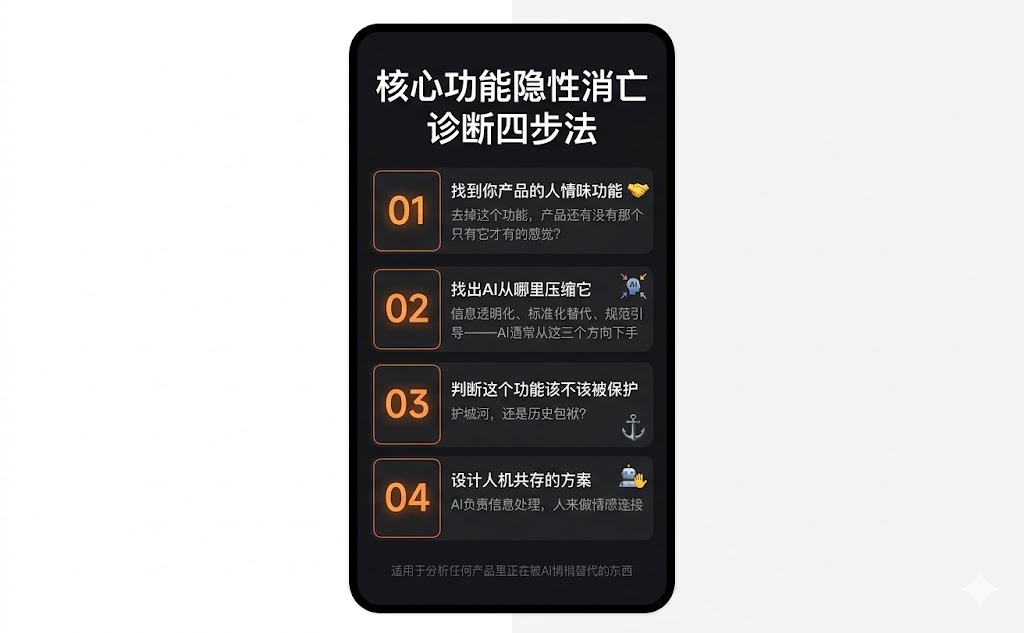 这套工具叫「核心功能隐性消亡诊断四步法」,不只适用于闲鱼,适用于任何一款被AI正在改造的产品。