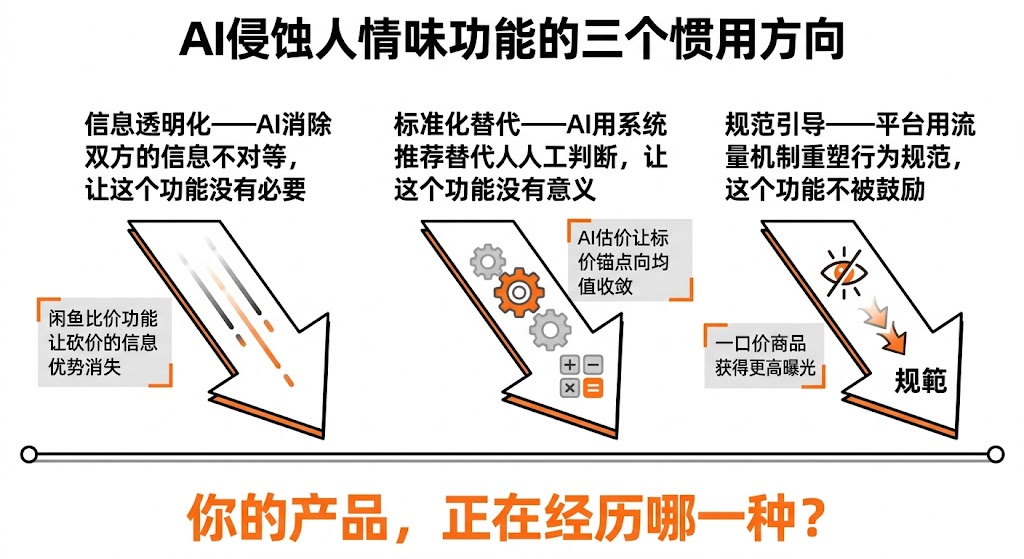 把这三个方向对照你自己的产品逐一检查——你产品里的「人情味功能」,正在被哪几种方式同时压缩?找到之后,你就能清楚地看到威胁从哪里来,而不是等到功能已经式微了才意识到。