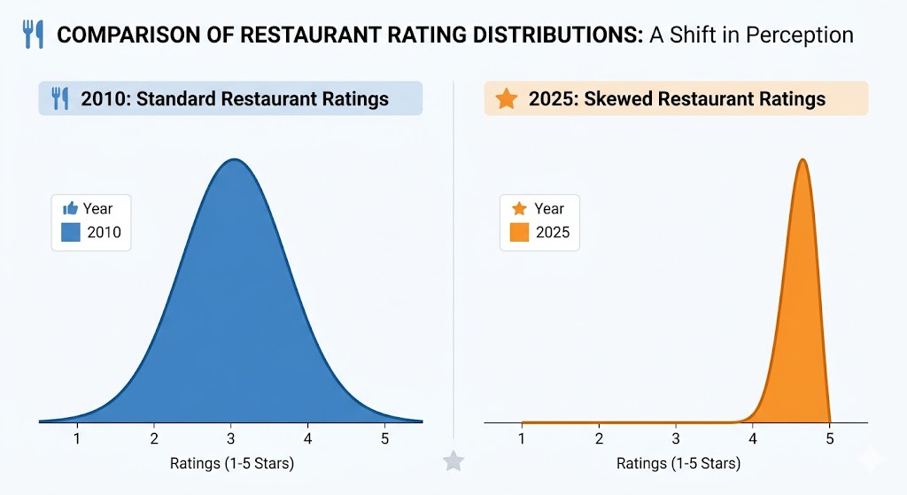 行为经济学中有一个被反复验证的现象:人在做评价时,天然倾向于极端化表达。非常满意的消费者会主动写长评,非常不满的消费者会写差评泄愤,而大量”还行””一般””凑合能吃”的中间体验——恰恰是最真实、最有参考价值的部分——被系统性地忽略了,因为这些消费者没有足够的动力去写评价。评价样本本身就是偏斜的,基于偏斜样本计算出的评分,当然不准。