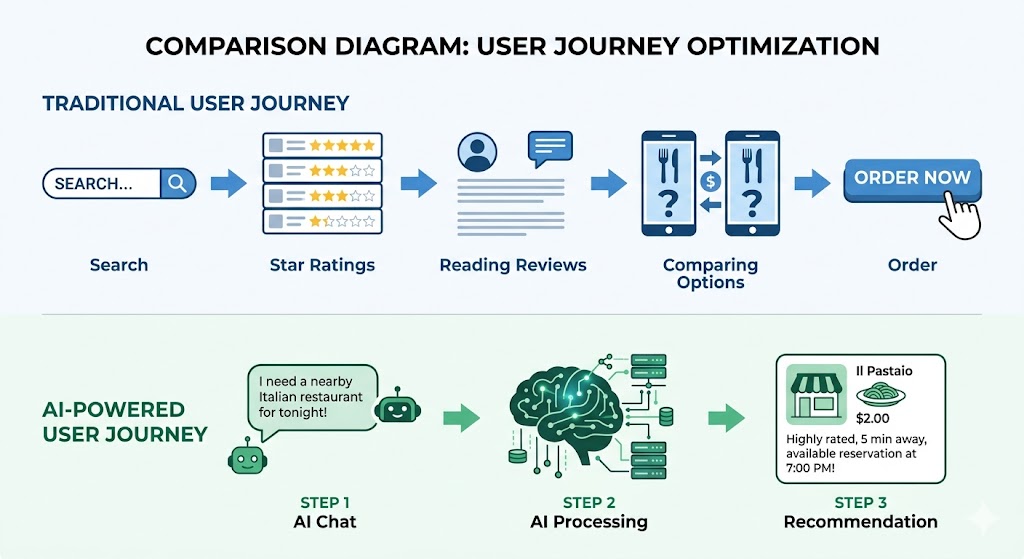 评分是一刀切的——4.8分对妈妈和情侣是同一个4.8分。但AI可以基于你当下的具体需求做语境化推荐。你说”今晚想找个能大声聊天、人均别超过150的地方”,AI可以从评价文本中提取”环境嘈杂度””消费水平””适合聚会”等维度,给出一个真正匹配你当下需求的推荐——而不是一个冷冰冰的排序列表。
