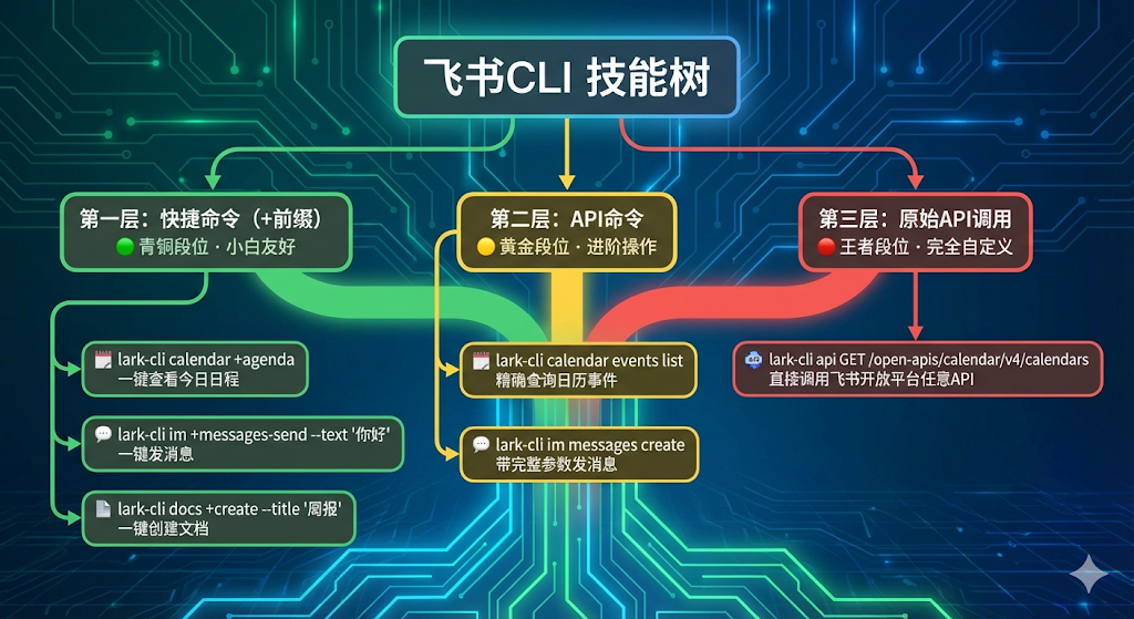 飞书CLI的命令系统设计成了三层架构,就像游戏里的技能树——你不需要全部点满,根据自己的段位选择就好。