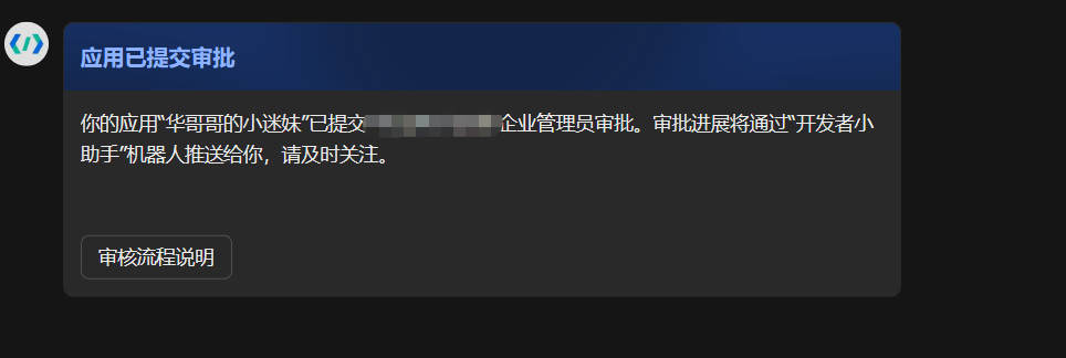 踩坑提醒:如果中间出现”审批中”的提示(企业管理员需要审批应用),你需要等审批通过后再继续。或者如果你是个人飞书用户,一般不会遇到这个问题。