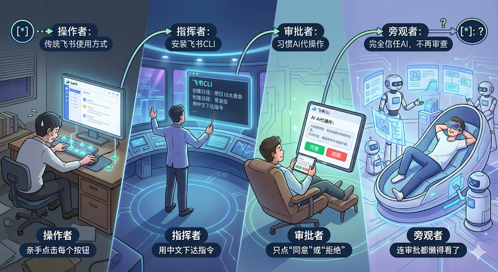 所有人都在欢呼CLI化让效率提升了,但没有人问一个更本质的问题——当AI替你操作飞书的那一刻,你从“操作者”变成了“审批者”,你真的想清楚了吗?