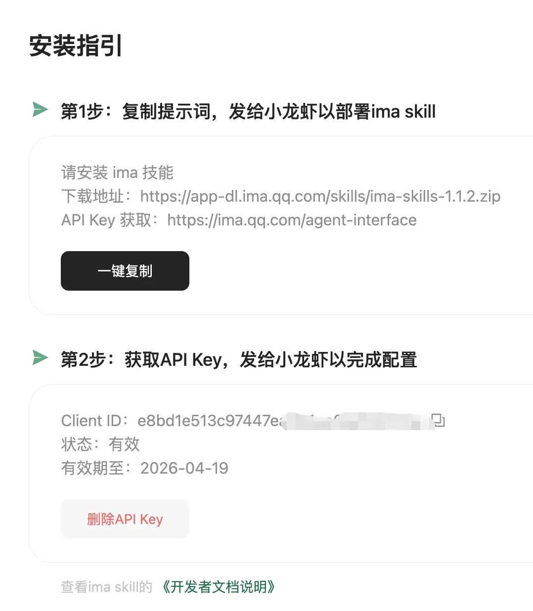 第一步 :打开https://ima.qq.com/agent-interface,点击生成你的 Client ID 和 API Key——这两串字符就是 WorkBuddy 进入你 IMA 的钥匙。