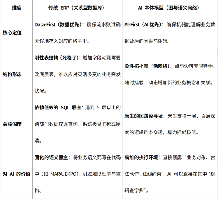传统 ERP 是“记录过去”的强事务账本,而本体论是“推演未来”的语义沙盘。