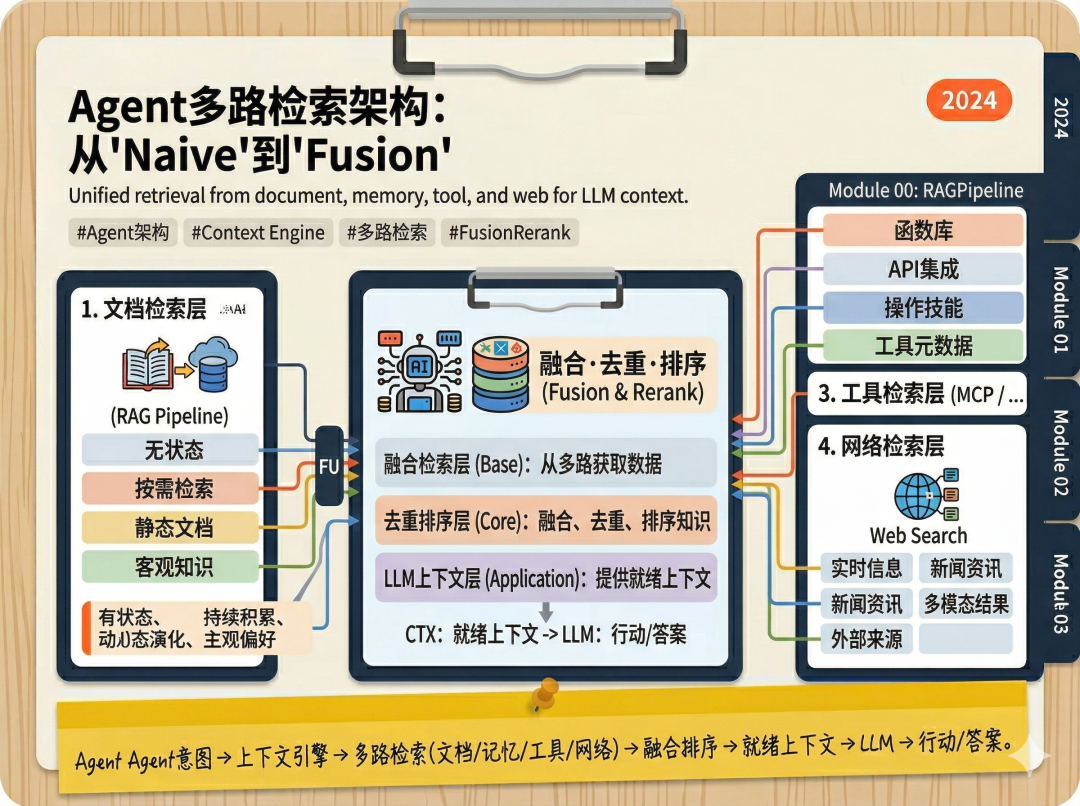 它不再是单纯的文档检索管道,而是Agent的统一上下文装配层。其核心职责是:理解Agent的当前意图,动态协调对文档库(RAG)、记忆库(Memory)、工具库(Tools/Skills)的检索请求,对多路来源的结果进行融合、去重、排序和格式化,最终打包成LLM就绪的上下文。